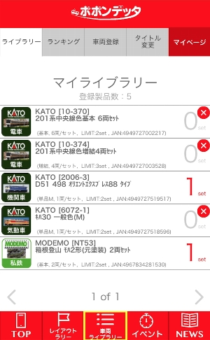 コンテンツ2 「車両ライブラリー」 お手持ちの鉄道模型をアプリに記憶させましょう。 所有車両の管理ができます。 「車両ライブラリー」に所有車両を登録したら、その 車両で「レンタルレイアウトラリー(コンテンツ1)」に 参加しましょう。 レンタルレイアウトで走行した車両の両数は「ランキ ング」に反映。 全国の鉄道模型&レンタルレイアウト愛好家と、「レ ンタルレイアウトで走らせた車両の数」を競い合うこと ができます。 |